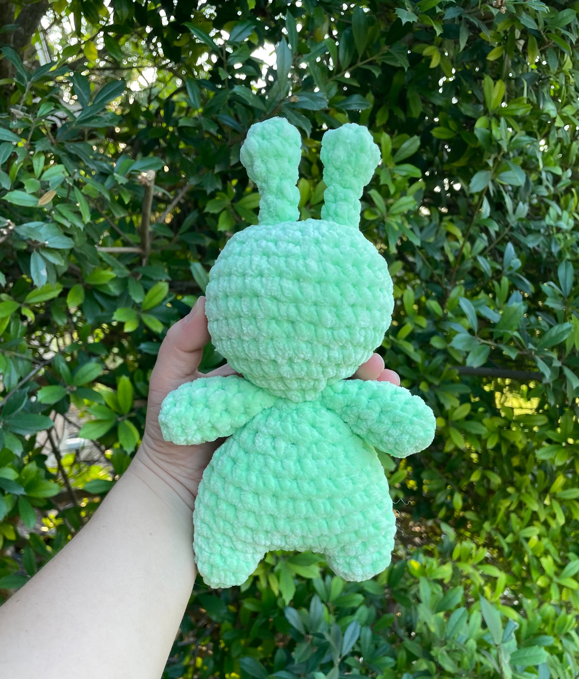 Crochet Alien that is available in green and pink! Approximately 7 1/2 inches tall