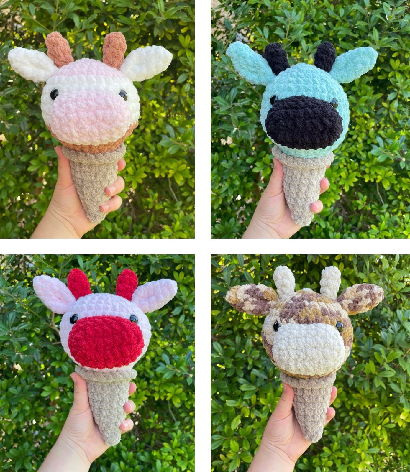 Crochet ice cream cows. Available in Strawberry, Neapolitan, Mint Chocolate Chip, Chocolate and Rocky Road