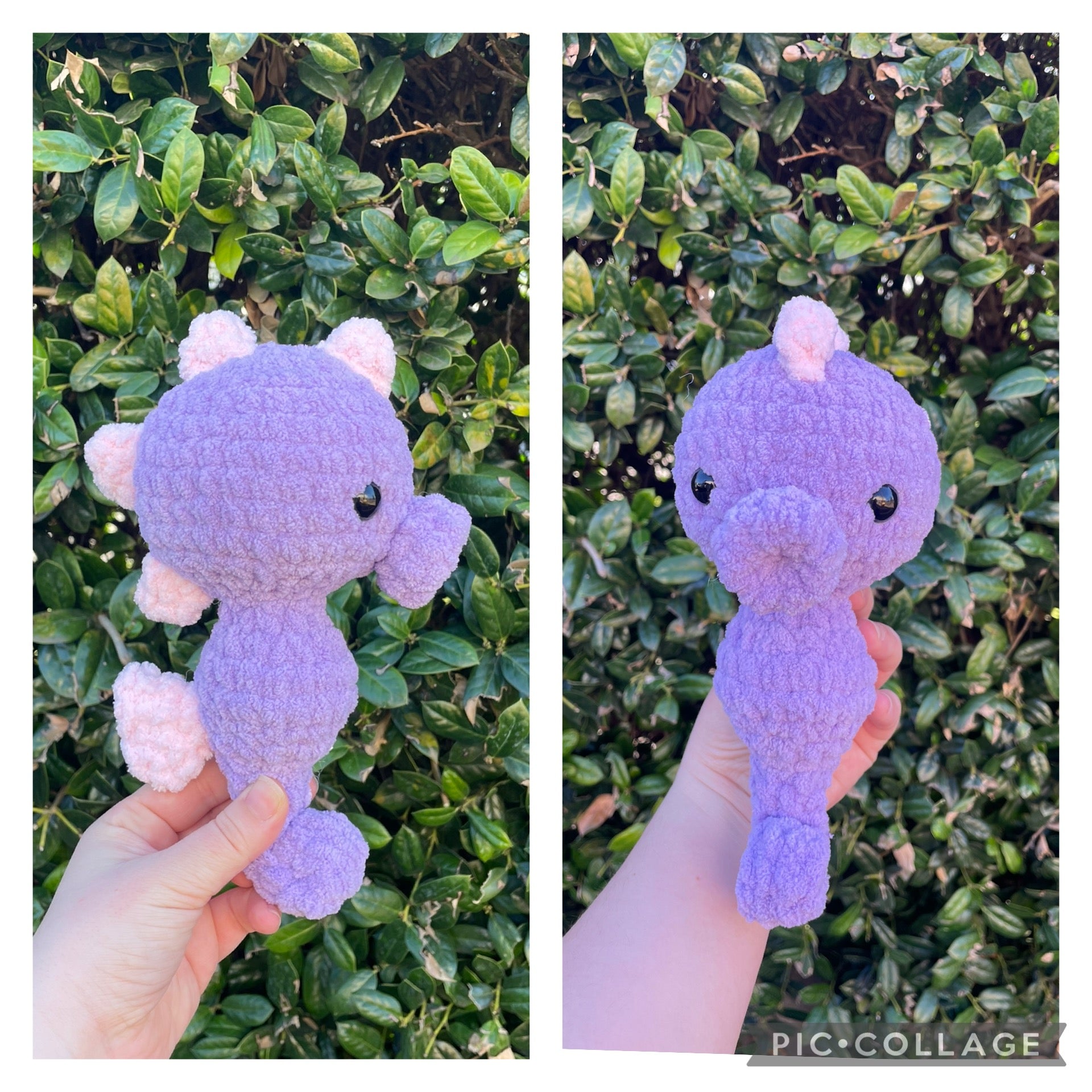 Crochet seahorse available in blue and purple! Approximately 9 inches tall