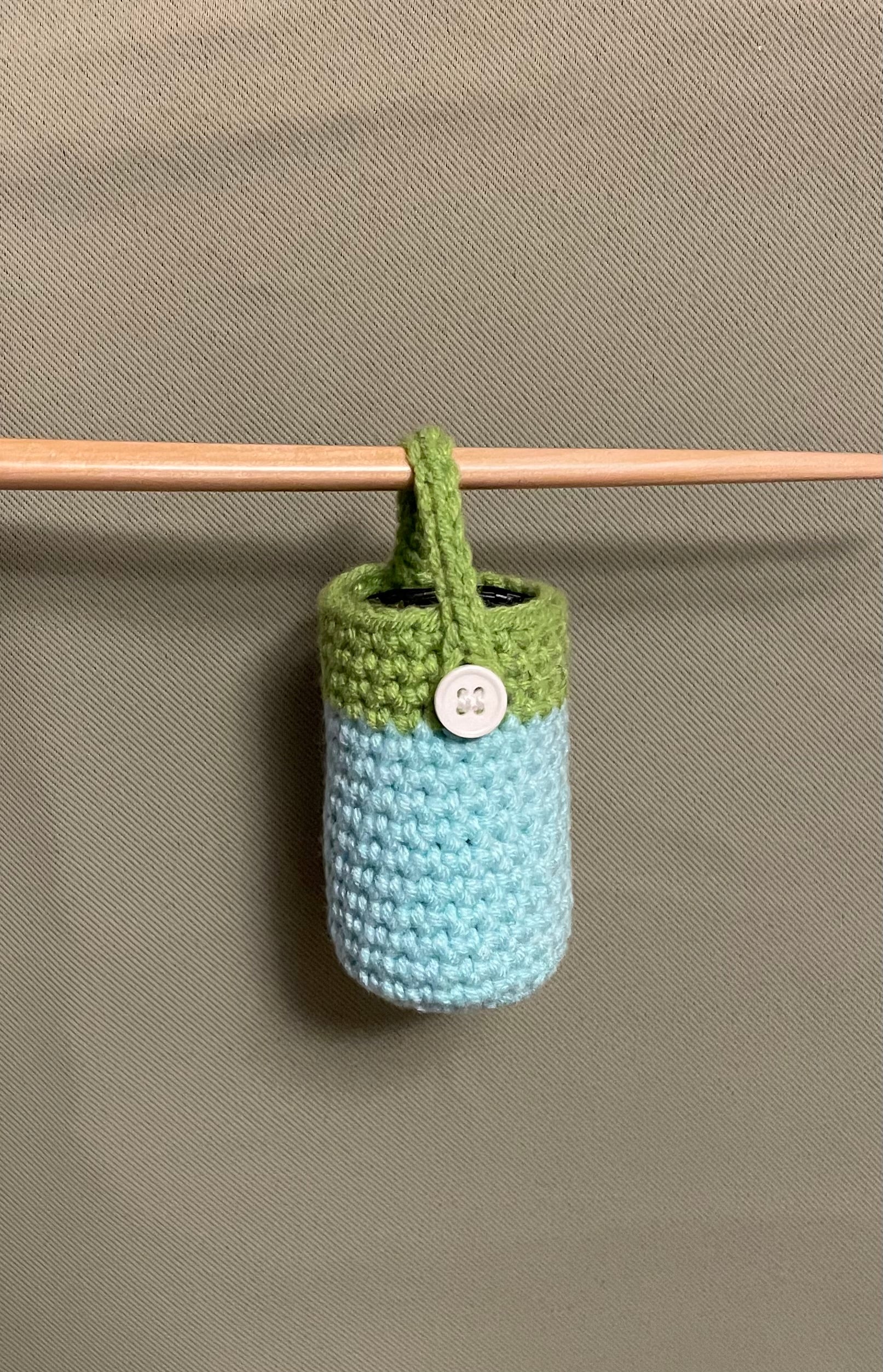 Crochet pop bag holder. Easy to open by unlatching the button to refill or clip onto a new bag or leash! Comes with one roll of bags.